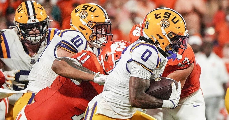 Brian Kelly has exorcised the demons! For all of the dunking that was done on the Tigers for their “1–0” antics ahead of this heavyweight matchup, LSU shut up a host of haters on Saturday. The game was not always pretty, as there were moments where it looked like LSU would choke yet again. When the replay booth called Barion Brown’s would be TD catch incomplete, I (lovingly) yelled to my wife, “WHAT IS A CATCH?!”. It seemed in that moment that Clemson would retake the momentum and find a way to win. And yet, a funny thing happened… the better team won. LSU came into this game with questions on the offensive line that seemed to me like a recipe for disaster against an NFL-laden Clemson defensive line. To combat Clemson’s pass rushers, the Tigers stuck to their running game, something they had failed to do almost all of last season. Also, can we talk about Blake Baker? He confused “Heisman favorite” Cade Klubnik all night, blitzing from the trees and outcoaching Clemson OC Garrett Riley. If LSU can get this kind of production out of their defense consistently, the Tigers should be the favorite to win the SEC this season.